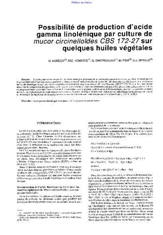 Résumé (autre langue) : Gamma 1inolenic acid (GLA) is a polyunsaturated fatty acid, used in pharmacy and cosmetics, which can be derived from phycomycetes fungi. In this study, we looked at the possibility of producing GLA by biotransformation of the linoleic acid in some vegetable oils, using a Mucor strain (M. circillenoides CBS 172-27). To this end, we determined the cellular glyceride composition of the strain during different culturing operations on oils containing different proportions of linoleic and a-linolenic ac1d. The fungus, cultured on various oils, produces varying amounts of GLA, depending on the linoleic acid content of the culture medium, but irrespective of the a-linolenic acid content. The mycelium of the fungus cultured on sunflower oil contains more than 65% oil with a GLA content of 17.4%.