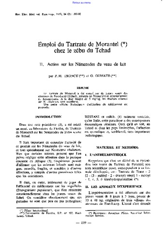 Troncy Pierre-Maurice, Oumate O.. 1973. Emploi du Tartrate de Morantel chez le zébu du Tchad. II. Action sur les Nématodes du veau de lait. Revue d'Elevage et de Médecine Vétérinaire des Pays Tropicaux, 26 (2) : 199-202.
