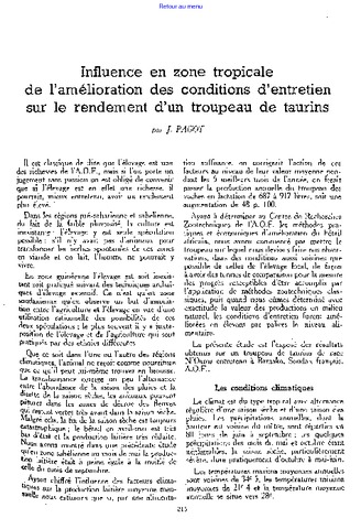 Pagot Jean. 1958. Influence en zone tropicale de l'amélioration des conditions d'entretien sur le rendement d'un troupeau de taurins. Revue d'Elevage et de Médecine Vétérinaire des Pays Tropicaux, 11 (2) : 213-222.