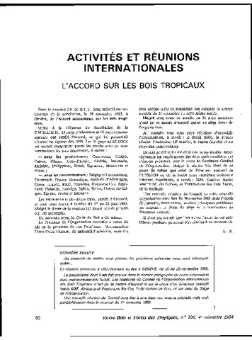 GERDAT-CTFT - FRA. 1984. Activités et réunions internationales : l'accord sur les bois tropicaux. Bois et Forêts des Tropiques (206) : 80.