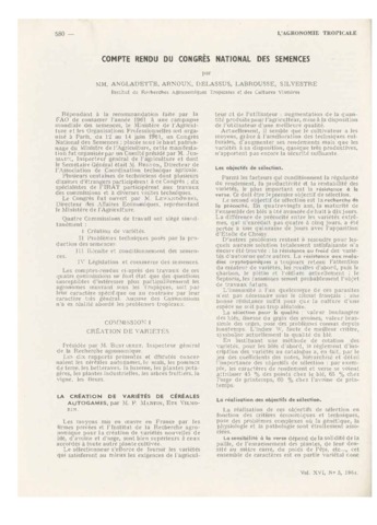 Angladette, Arnoux, Delassus, Labrousse, Silvestre. 1961. Compte-rendu du congrès national des semences. L'Agronomie Tropicale (1946), 16 (5) : 580-594. Congrès national des semences, Paris, France, 12 Juin 1961/14 Juin 1961.