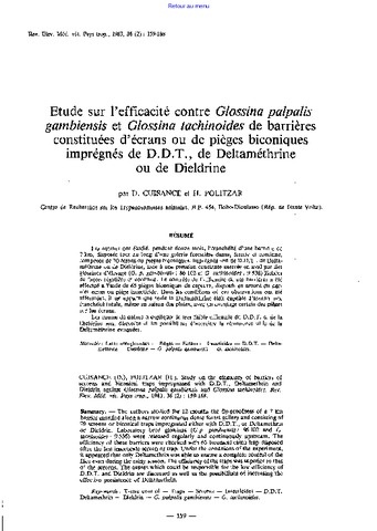 Autre titre : Study on the efficiency of barriers of screens and biconical traps impregnated with DDT, Deltamethrin and Dieldrin against Glossina palpalis gambiensis and Glossina tachinoides Burkina
