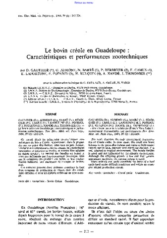 Gauthier Daniel, Aumont Gilles, Barré Nicolas, Berbigier Paul, Camus Emmanuel, Lafortune E., Popescu P., Rulquin H., Xandé Alain, Thimonier J.. 1984. Le bovin créole en Guadeloupe : Caractéristiques et performances zootechniques. Revue d'Elevage et de Médecine Vétérinaire des Pays Tropicaux, 37 (2) : 212-224.