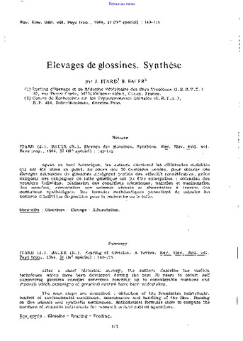 Itard Jacques, Bauer Burkhard. 1984. Elevages de glossines. Synthèse. Revue d'Elevage et de Médecine Vétérinaire des Pays Tropicaux, 37, n.spéc. : 143-175.