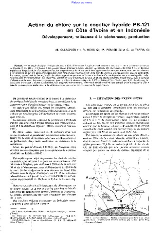 Ollagnier Michel, Ochs Robert, Pomier M., De Taffin Gabriel. 1983. Action du chlore sur le cocotier hybride PB-121 en Côte d'Ivoire et en Indonésie. Développement, tolérance à la sécheresse, production. Oléagineux, 38 (5) : 309-321.