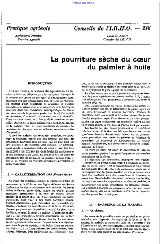 Résumé : En Côte d'Ivoire, le contexte des replantations de palmiers à huile est différent de celui existant à l'époque de la création sur savane ou sur forêt. Il s'en distingue essentiellement par une implantation assez difficile du Pueraria, · au bénéfice d'une végétation de graminées et d'autres dicotylédones adventices, une couverture très hétérogène remplace donc une couverture monospécifique de Pueraria. Au cours de la première génération, le sol s'est enrichi en potassium, s'est acidifié, et sa structure s'est dégradée. Dans certaines zones, la présence de la fusariose en première génération, a laissé craindre une apparition précoce de la maladie. Dans de telles conditions de cultures, les contrôles au champ et une surveillance sanitaire attentive s'imposaient. A côté des maladies ou anomalies attendues, cercosporiose et fusariose, dégâts dus aux Oryctes, aux rats, des symptômes nouveaux sont apparus, qui ne pouvaient pas être associés à des maladies déjà connues. Ce dépérissement appelé " pourriture sèche du coeur ", une fois bien caractérisé a pu être recensé dans toutes les replantations et son évolution a été suivie. La présente note en décrit les symptômes afin de permettre au planteur de bien l'identifier et de prendre les mesures préventives nécessaires en zones favorables.