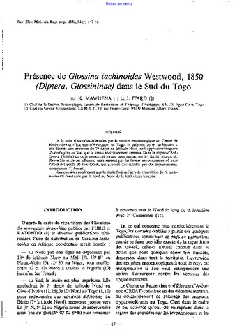 Résumé : A la suite d'enquêtes effectuées par la section entomologique du Centre de Recherches et d'Elevage d'Avétonou, au Togo, la présence de G. tachinoides a été décelée aux environs du 7e degré de latitude Nord, soit approximativement deux degrés plus au Sud que la limite antérieurement connue. Dans la région d'Avétonou, l'habitat de cette espèce est formé, pour partie, par les forêts galeries du fleuve Sio et de ses affluents, mais surtout par les fermes environnantes où sont élevés des porcs de race locale, qui peuvent être infectés par des trypanosomes notamment T. brucei. Ces enquêtes confirment que la limite Sud de l'aire de répartition de G. tachinoides est constituée par la bordure Nord de la forêt dense humide