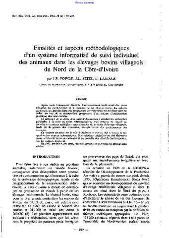Poivey Jean-Paul, Seitz J.L., Landais Etienne. 1981. Finalités et aspects méthodologiques d'un système informatisé de suivi individuel des animaux dans les élevages bovins villageois du Nord de la Côte d'Ivoire. Revue d'Elevage et de Médecine Vétérinaire des Pays Tropicaux, 34 (2) : 199-210.
