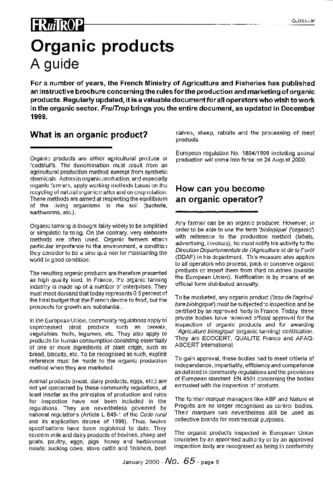 Résumé : For a number of years, the French Ministry of Agriculture and Fisheries has published an instructive brochure concerning the rules for the production and marketing of organic products. Regularly updated, it is a valuable document for all operators who wish to work in the organic sector. FruiTrop brings you the entire document, as updated in December 1999.