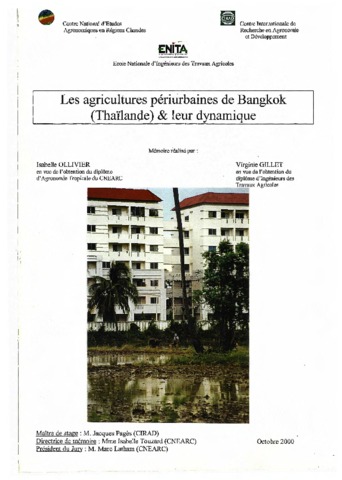 Ollivier Isabelle, Gillet Virginie. 2000. Les agricultures périurbaines de Bangkok (Thaïlande) et leur dynamique. Montpellier : CNEARC, 234 p. Mémoire DAT : Centre national d'études agronomiques des régions chaudes
