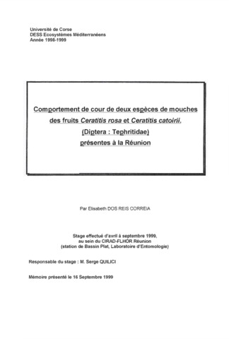 Dos Reis Correia Elisabeth. 1999. Comportement de cour de deux espèces de mouches des fruits Ceratitis rosa et Ceratitis catoirii (Diptera : Tephritidae) présentes à la Réunion. Corte : Université de Corse, 54 p. Mémoire DESS : Ecosystèmes méditerranéens : Université de Corse