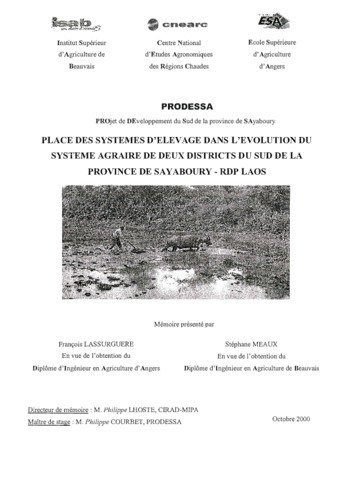 Lassurguere François, Meaux Stéphane. 2000. Place des systèmes d'élevage dans l'évolution du système agraire de deux districts du sud de la province de Sayaboury - RDP Laos : PRODESSA. Projet de développement du sud de la province de Sayaboury. Beauvais : ISAB, 222 p. Mémoire d'ingénieur : Agriculture : Institut supérieur d'agriculture de Beauvais