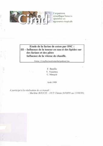 Bonfils Frédéric, Vialettes Viviane, Marquié Catherine. 1999. Etude de la farine de coton par DSC : III. Influence de la teneur en eau et des lipides sur des farines et des pâtes. Influence de la vitesse de chauffe. Montpellier : CIRAD-CA, 18 p.