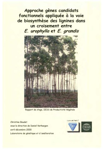 Boudet Christine. 2000. Approche gènes candidats fonctionnels appliquée à la voie de biosynthèse des lignines dans un croisement entre E. urophylla et E. grandis. Paris : Université de Paris VII, 75 p. Mémoire DESS : Productivité végétale : Université de Paris VII