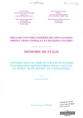 Fediaevsky Alexandre. 2000. Contribution à la mise en place d'un système d'information géographique pour l'analyse du risque "peste bovine" en Centrafrique. Paris : MNHN, 105 p. Mémoire DESS : Productions animales en régions chaudes : Muséum national d'histoire naturelle