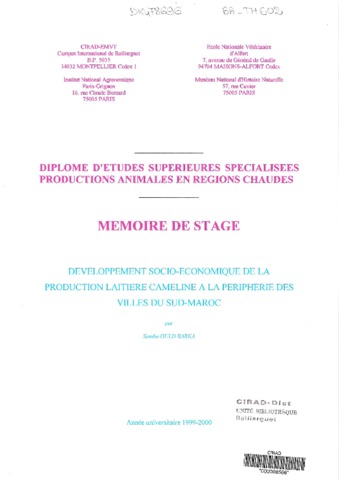 Ould Barka Samba. 2000. Développement socio-économique de la production laitière cameline à la périphérie des villes du Sud-Maroc. Paris : MNHN, 113 p. Mémoire DESS : Productions animales en régions chaudes : Muséum national d'histoire naturelle