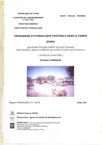 Corniaux Christian. 2001. Programme d'hydraulique pastorale dans le kamen (PHPK). Quatrième mission d'appui au volet systèmes d'élevage et ressources pastorales du projet d'hydraulique pastorale dans le Kanem - PHPK : 19 mars au 10 avril 2001. Montpellier : CIRAD-EMVT, 57 p. N° de rapport : CIRAD-EMVT N 01-36