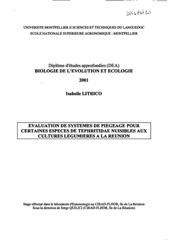 Litrico Isabelle. 2001. Evaluation de systèmes de piégeage pour certaines espèces de Tephritidae nuisibles aux cultures légumières à la Réunion. Montpellier : UM2, 10 p. Mémoire DEA : Biologie de l'évolution et écologie : Université Montpellier 2