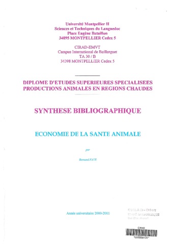 Faye Bernard. 2001. Economie de la santé animale. Montpellier : UM2, 34 p. Mémoire DESS (Synthèse bibliographique) : Productions animales en régions chaudes : Université Montpellier 2
