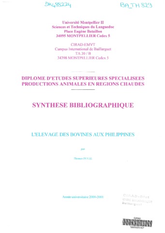Duval Thomas. 2001. L'élevage des bovines aux Philippines. Montpellier : UM2, 37 p. Mémoire DESS (Synthèse bibliographique) : Productions animales en régions chaudes : Université Montpellier 2