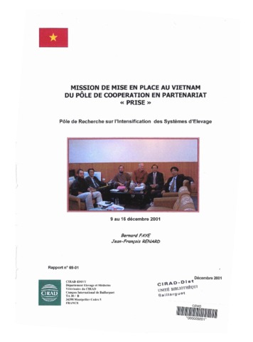 Faye Bernard, Renard Jean-François. 2001. Mission de mise en place au Vietnam du pôle de coopération en partenariat PRISE : pôle de recherche sur l'intensification des systèmes d'élevage. Montpellier : CIRAD-EMVT, 39 p. N° de rapport : CIRAD-EMVT N°69-01