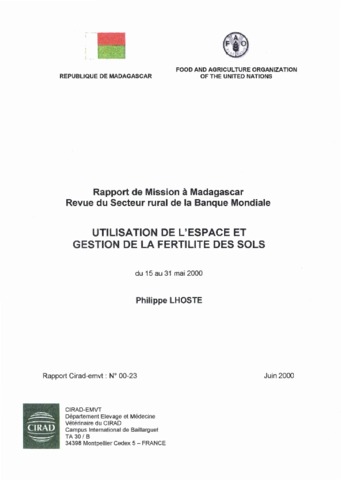Lhoste Philippe. 2000. Revue du secteur rural de la Banque mondiale : utilisation de l'espace et gestion de la fertilité des sols. Rapport de mission à Madagascar du 15 au 31 mai 2000. Montpellier : CIRAD-EMVT, 53 p. N° de rapport : CIRAD-EMVT N°00-23