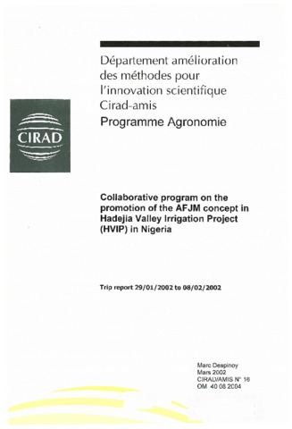 Despinoy Marc. 2002. Collaborative program on the promotion of the AFJM concept in Hadejia Valley Irrigation Project (HVIP) in Nigeria : Trip report 29/01/2002 to 08/02/2002. Montpellier : CIRAD-AMIS, 32 p. N° de rapport : CIRAD-AMIS N°16