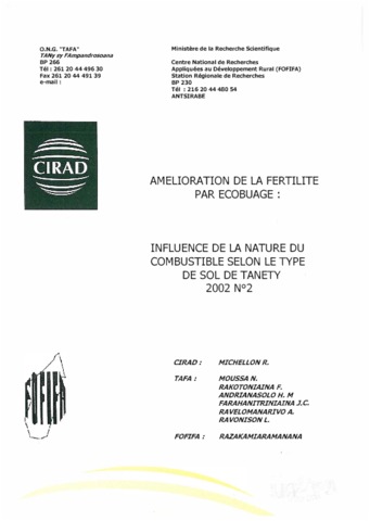 Michellon Roger, Moussa Narcisse, Rakotoniaina Florisat, Andrianasolo Hasina M., Farahanitriniaina J.C., Ravelomanarivo A., Ravonison L., Razakamiaramanana. 2002. Amélioration de la fertilité par écobuage : influence de la nature du combustible selon le type de sol de tanety. Fiche d'essai 2002 n°2. Montpellier : CIRAD-CA, 32 p.