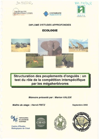 Valeix Marion. 2002. Structuration des peuplements d'ongulés : un test du rôle de la compétition interspécifique par les mégaherbivores. Paris : INA-PG, 43 p. Mémoire DEA : Ecologie : Institut national agronomique Paris-Grignon