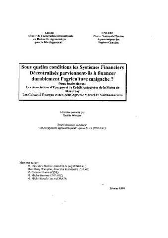 Wietzke Emilie. 1999. Sous quelles conditions les systèmes financiers décentralisés parviennent-ils à financer durablement l'agriculture malgache ? : les caisses d'épargne et de crédit agricole mutuel du Vakinankaratra (Volume 2). Montpellier : CNEARC, 184 p. Mémoire de master : Développement agricole tropical. AGIR : Centre national d'études agronomiques des régions chaudes