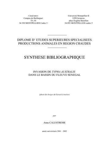 Calestreme Anne. 2002. Invasion de Typha australis dans le bassin du fleuve Sénégal. Montpellier : UM2, 30 p. Mémoire DESS (Synthèse bibliographique) : Productions animales en régions chaudes : Université Montpellier 2