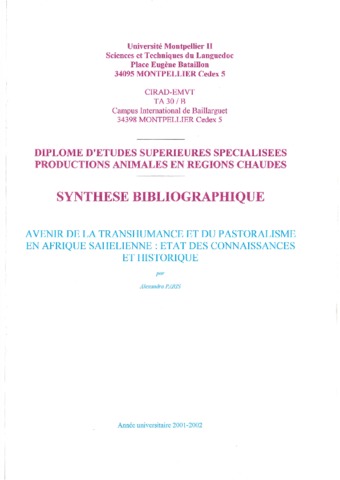 Paris Alexandra. 2002. Avenir de la transhumance et du pastoralisme en Afrique sahélienne : état des connaissances et historique. Montpellier : UM2, 37 p. Mémoire DESS (Synthèse bibliographique) : Productions animales en régions chaudes : Université Montpellier 2