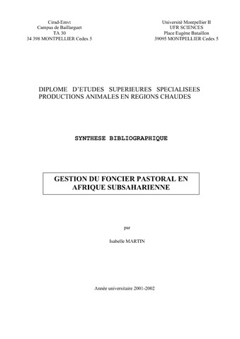 Martin Isabelle. 2002. Gestion du foncier pastoral en Afrique subsaharienne. Montpellier : UM2, 33 p. Mémoire DESS (Synthèse bibliographique) : Productions animales en régions chaudes : Université Montpellier 2