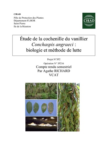 Richard Agathe. 2002. Etude de la cochenille du vanillier Conchaspis angraeci : biologie et méthode de lutte : Projet n°3P2, opération n°3P216. Compte rendu semestriel septembre 2002. Saint-Pierre : CIRAD-FLHOR, 33 p.