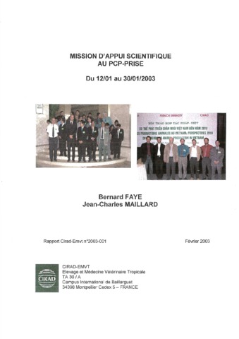 Faye Bernard, Maillard Jean-Charles. 2003. Mission d'appui au PCP-PRISE : du 12/01 au 30/01/2003. Montpellier : CIRAD-EMVT, 19 p. N° de rapport : CIRAD-EMVT N° 2003-001