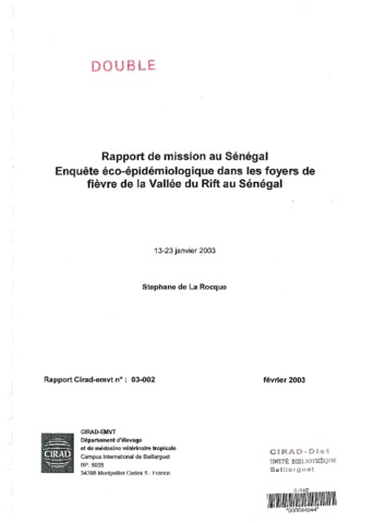 De La Rocque Stéphane. 2003. Rapport de mission au Sénégal . Enquête éco-épidémiologique dans les foyers de fièvre de la Vallée du Rift au Sénégal, 13 - 23 janvier 2003. Montpellier : CIRAD-EMVT, 22 p. N° de rapport : CIRAD-EMVT N° 2003-002