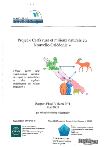De Garine-Wichatitsky Michel. 2003. Projet Cerfs rusa et milieux naturels en Nouvelle-Calédonie : pour gérer une cohabitation durable des espèces introduites et des espèces endémiques en milieu insulaire. Rapport final. Montpellier : CIRAD-EMVT, 2 vol. (82, 250 p.) N° de rapport : CIRAD-EMVT N° XX-03