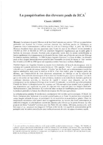 Résumé : La présence de peuls Mbororo et de leur bétail remonte aux années 1920 car ces populations pastorales qui fuyaient les diverses exactions émanant des chefferies peules de l'Adamawa au Cameroun voisin commencèrent à affluer dans le nord de l'Oubangui-Chari. A partir de 1930 les Mbororo étendirent leurs parcours pastoraux dans l'ouest du pays et les effectifs bovins (estimés à 150.000 en 1933 et 200.000 en 1937) ne cessèrent d'augmenter régulièrement par la suite grâce à l'arrivée de nouveaux éleveurs. Pourtant cette progression rapide dans la savane centrafricaine se heurta rapidement à la trypanosomose et à la peste bovine. Grâce aux efforts des services de l'Elevage la situation sanitaire s'améliora.. En 1984 le pays disposait d'environ 2 millions de têtes. Les éleveurs peuls et leur cheptel étaient désormais présents dans l'ensemble des zones de savane et leur nombre était évalué à 210.000 en 1985 (pour une population totale d'environ 3 millions d'habitants.). Pourtant depuis une vingtaine d'années on assiste à une diminution de la taille des troupeaux avec la survenue de la grande épizootie de peste bovine en 1983, appelée "Pettu", qui a malheureusement coïncidé avec la grande sécheresse baptisée "Ceedua" par les Peuls, qui a principalement touché les régions sahéliennes, mais aussi le nord de la RCA. Ceci s'est traduit, pour la majeure partie des éleveurs, par l'impossibilité de vivre désormais uniquement de l'élevage et par la nécessité de diversifier leurs activités économiques et leurs revenus monétaires pour pouvoir subsister. Les choix qui se sont portés sur l'agriculture, le petit commerce, la pêche ou la recherche de diamants, parfois en combinant plusieurs activités, en fonction du capital à investir pour démarrer, ont eu des conséquences sur les pratiques d'élevage et sur la mobilité pastorale. Les activités agricoles présentent l'intérêt de limiter la décapitalisation du troupeau car l'éleveur-agriculteur produit tout ou partie de son alimentation qui représente un poste de dépenses très important dans les budgets familiaux. Malheureusement, cette diminution du nombre de bêtes vendues est insuffisante pour pouvoir inverser latendance générale à la baisse des effectifs du troupeau des éleveurs-agriculteurs. La sédentarisation entraîne de nombreuses conséquences tant sociales qu'économiques. D'abord, les Peuls s'intègrent plus facilement à la société centrafricaine en se fixant. Ils parlent plus volontiers le sango, langue nationale du pays, et participent à la vie associative et municipale en général. Dans les campements sédentaires mais surtout dans les agglomérations, les besoins des Peuls (alimentaires et culturels) changent et cela implique souvent des dépenses plus élevées qu'en pleine brousse. La ville propose des biens "culturels" nouveaux pour les Peuls tels que cinéma, télévision, journaux etc. qu'il faut payer et qui proposent des images de l'Afrique et du monde. Cet appétit de consommation qu'ils partagent avec les autres centrafricains peut malheureusement aboutir à un appauvrissement rapide.