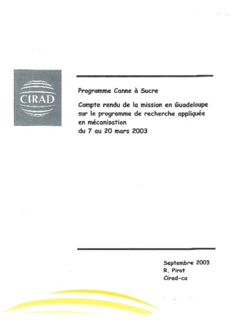 Pirot Roland. 2003. Compte rendu de la mission en Guadeloupe sur le programme de recherche appliquée en mécanisation du 7 au 20 mars 2003 : Programme européen DOCUP 2000-2006. Contrat d'entreprise du Cirad-Ca - 2ème tranche - Année 2003. Programme de travaux d'appui au développement de la canne à sucre en Guadeloupe. Rapport d'activités. Montpellier : CIRAD-CA, 6 p.
