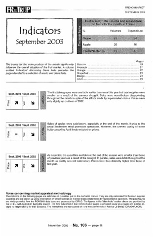 Résumé : Banana: The market emerged from the serious difficulties experienced in August. Performance was nonetheless distinctly worse than average. On the one hand, cumulated shipments from the main origins supplying the French market were substantial and the quality of fruits from Martinique was very uneven. On the other, demand was slack on both the domestic and export markets. Avocado: Performance was satisfactory. The average price did not reach last year's excellent level but was distinctly above average even though the volumes sold were larger than in 2002 and higher than the average for the last few years. Orange: Performance was satisfactory in September. Although supplies were plentiful at the beginning of the month, they decreased considerably in the second half of the month in particular as a result of the early end to South African shipments. In parallel, demand was lively throughout the month thanks to numerous store promotion operations and partly because Spanish clementines were slightly late. Grapefruit: Market performance was excellent in September once again. The small volumes available and the good promotion visibility enabled Honduras to sell markedly larger quantities than last year at very satisfactory prices. Mango West African season: September was another transition period in mango supply, with a gradual decrease in arrivals from Senegal and the restarting of shipments from Brazil. Israel supplied the major part of the tonnage during the period, complemented by exports from Spain. The traditional September gap in European market supply did not really affect prices as demand was comparatively sluggish. Litchi: September was a period of recovery after the summer holidays. Demand was not very lively overall. Supplies of fruit and vegetables were fairly reduced, explaining the high selling prices. Tropical fruits did not really profit from these sales conditions as demand for this type of produce is limited.