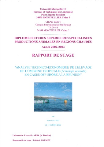 Gauchet Rémi. 2003. Analyse technico-économique de l'élevage de l'ombrine tropicale (Sciaenops ocellata) en cages off-shore à la Réunion. Montpellier : UM2, 63 p. Mémoire DESS : Productions animales en régions chaudes : Université Montpellier 2