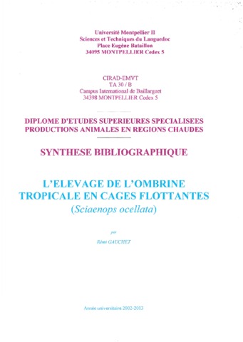 Gauchet Rémi. 2003. L'élevage de l'ombrine tropicale en cages flottantes (Sciaenops ocellata). Montpellier : UM2, 33 p. Mémoire DESS (Synthèse bibliographique) : Productions animales en régions chaudes : Université Montpellier 2