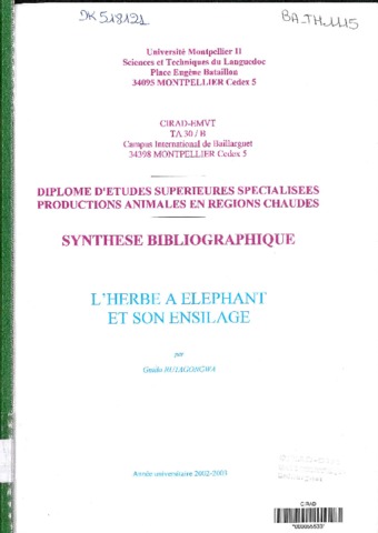 Rutagongwa Guido. 2003. L'herbe à éléphant et son ensilage. Montpellier : UM2, 30 p. Mémoire DESS (Synthèse bibliographique) : Productions animales en régions chaudes : Université Montpellier 2