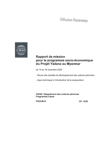 Paulin Didier. 2003. Rapport de mission pour le programme socio-economique du projet Yadana au Myanmar du 10 au 15 novembre 2003 : revue des activités de développement des cultures pérennes. Appui technique à l'introduction de la cacaoculture. Montpellier : CIRAD-CP, 30 p. N° de rapport : CP_SIC 1679