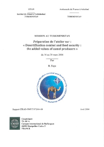 Faye Bernard. 2004. Préparation de l'atelier sur : Desertification combat and food security : the added values of camel producers. Mission au Turkmenistan du 16 au 20 mars 2004. Montpellier : CIRAD-EMVT, 15 p. N° de rapport : CIRAD-EMVT N° 2004-08