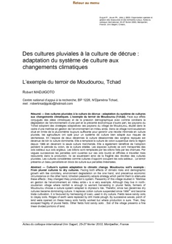 Titre anglais : Culture's systems adaptation to climatic change. Moudourou soil's example : from pluvial cultures to dry cultures