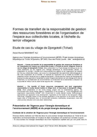 Titre anglais : The transfer of forest resources management and land organisation responsibility to locally elected bodies at village level. A case-study in Djongotolli village Chad