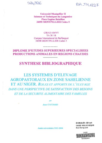 Guichard Anne. 2004. Les systèmes d'élevage agropastoraux en zone sahélienne et au Niger : rôles et apports de l'élevage dans une perspective de satisfaction des besoins et de la sécurité alimentaire des familles. Montpellier : UM2, 55 p. Mémoire DESS (Synthèse bibliographique) : Productions animales en régions chaudes : Université Montpellier 2