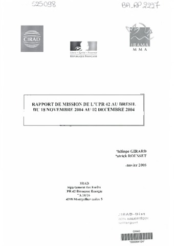 Girard Philippe. 2005. Rapport de mission de l'UPR 42 au Brésil du 18 novembre 2004 au 02 décembre 2004. Montpellier : CIRAD-Forêt, 13 p.