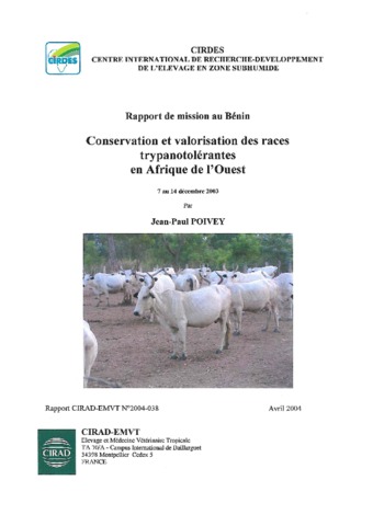 Poivey Jean-Paul. 2004. Conservation et valorisation des races trypanotolérantes en Afrique de l'Ouest : rapport de mission au Bénin du 7 au 14 décembre 2003. Montpellier : CIRAD-EMVT, 75 p. N° de rapport : CIRAD-EMVT N°2004-038